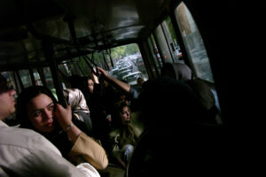 IRAN. Tehran, May 2005. Valiasr Avenue. A couple between the men’s and women’s sections of the bus.