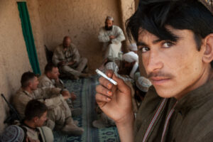 AFGHANISTAN. Near Delaram, between the Nimroz and Helmand provinces, August 2010. Outside of the US military base in Delaram. Georgian soldiers meeting locals during a patrol in Pashtu villages. Discussing security issues due to increasing Taliban attacks and influence.
